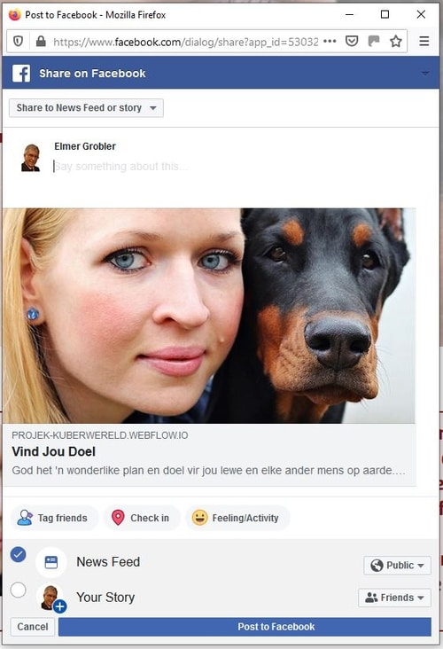2. Die "Share on Facebook" venster sal nou oopmaak. Maak nou die venstertjie "Share to News Feed or story" links-bo oop en kies die bestemming van jou pos -- jou hoofblad, 'n groep, of ander bladsy wat jy bestuur - in hierdie geval jou Uitreikbladsy.
