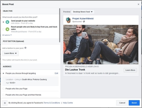 Ons wil hieronder aan jou verduidelik hoe om 'n betaalde Facebook uitreikveldtog te loods. Met 'n klein begroting vanaf ongeveer R150 per maand, kan jy honderde en selfs duisende mense bereik wat nie jou vriende is nie. Volg die stappe hieronder.